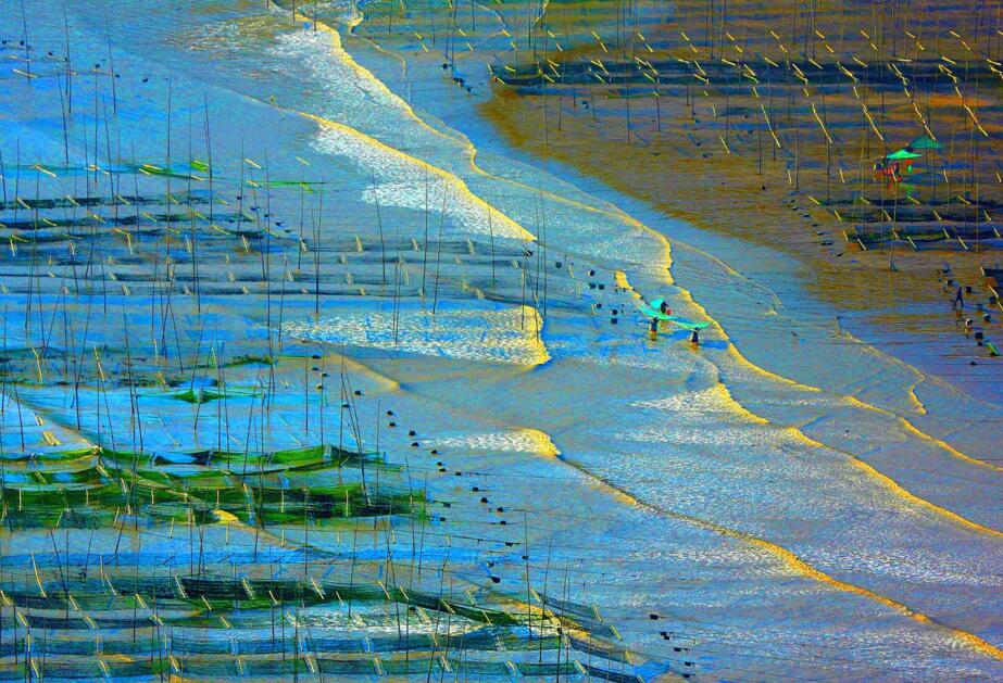 1.有人有景,營造情景交融的場景。霞浦灘涂常年都有人在勞作,點綴在灘涂上的人遠處看去雖然是星星點點的,但是往往是畫龍點睛之筆。