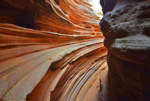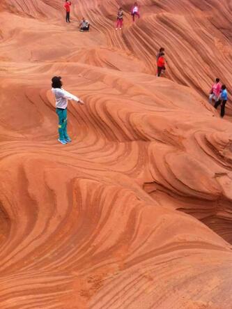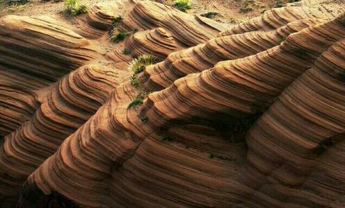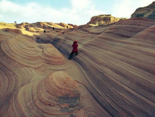 波浪谷是一種紅砂巖地貌,因巖砂上的紋路像波浪,被叫做"TheWave",即波浪。上世紀(jì)80年代,人們在美國亞利桑那州和猶他州交界處發(fā)現(xiàn)了波浪谷,神奇的外觀和極高的科研價值使其成為了世界八大巖石奇觀之一。而靖邊的波浪谷也有著與美國波浪谷媲美的紅砂巖峽谷。中國靖邊波浪谷和美國波浪谷的差距并不大,都是紅砂巖地貌,靖邊波浪谷更加年輕,只有6000萬年,很多砂土還沒來得及凝固為巖石,地處黃土高原與毛烏素沙漠交匯地帶的靖邊縣龍州鄉(xiāng)。