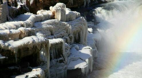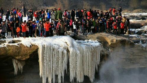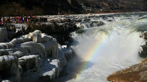 觀賞黃河壺口瀑布黃河壺口瀑布,其奔騰洶涌的氣勢如同中華民族的精神。它西臨陜西省延安市宜川縣壺口鄉(xiāng),東瀕山西省吉縣。黃河至此兩岸石壁峭立,河口收束狹如壺口,故名壺口瀑布。瀑布落差9米,蘊(yùn)藏豐富的水力資源。奔騰的黃河水聲震天地,絢麗的彩虹美輪美奐,輕煙生水底,冰掛透晶瑩,黃河壺口冬季美麗的自然景觀讓游人們流連忘返。