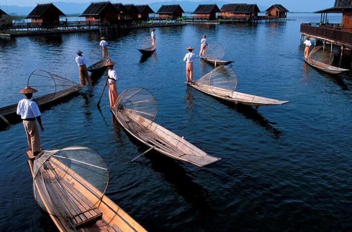 飯店內(nèi)早餐后,乘坐當?shù)靥厣未斡[風(fēng)光旖旎的茵萊湖。茵萊湖是緬甸第二大湖,三面環(huán)山,水質(zhì)清澈,湖底水草清晰可見,湖水的顏色隨著每天日出日落而發(fā)生變化。當?shù)匾疬_族人的村寨依湖而建,高腳屋、學(xué)校、商店等各種生活設(shè)施均佇立水中,當?shù)厝说娘嬍称鹁泳篮?,交通往來全依靠船只,是名副其實的水上村寨。當?shù)厝颂赜械膭澊绞绞钦驹诖玻帜_并用的劃船。乘船參觀坐落在湖上的【水中佛塔】,在此可以欣賞俗稱【貓?zhí)?/strong>】的【波道烏寺】中的緬甸貓在寺中僧人的訓(xùn)練下,可以為游人表演鉆圈,寺中的五世佛像是艷麗湖的至尊,寺中的佛塔金光燦燦,全寺全部由柚木建成,木雕技藝精湛,其本身就是一座藝術(shù)寶庫;參觀水上【手工織布制衣作坊】、【卷煙作坊】、【鐵器生產(chǎn)作坊】,與【長頸族家庭】拍照,參觀當?shù)孛恐芤淮蔚募小?strong>水上市場】,領(lǐng)略緬甸獨特的水上村寨生活。午餐在風(fēng)光奇美的【水上餐廳】用餐,品嘗湖中的特產(chǎn)魚。晚入住水邊的木屋別墅。