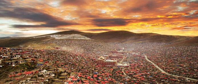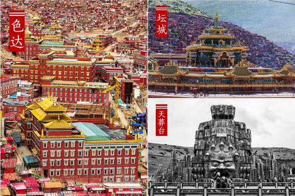 喇榮溝的一條峽谷里面,峽谷兩旁的都是密密麻麻的小紅房子,里面住著兩三萬僧眾。進溝左側(cè)住著的是女眾,稱為覺姆;進溝右側(cè)住著的是男眾,稱為喇嘛;峽谷中間屹立著兩座高大雄偉的經(jīng)殿,這里是僧眾上課的地方,靠近溝口的是女眾經(jīng)殿,靠里面的是男眾經(jīng)殿。進入佛學院以后,可以去參觀他們上課的經(jīng)殿,還可以在一旁旁聽,近距離的感受藏傳佛教的魅力。大片的紅房子也一道靚麗的風景線,可以爬到上頂,拍這壯麗的全景。在佛學院背面的上坡上,每天都要舉行一場盛大儀式---