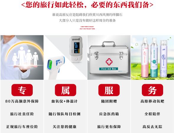 4.一份專業(yè):全團配備公用應急藥箱1個、全團配備公用血氧儀1個、全團配備溫度計1支、全團貴賓每日血氧監(jiān)測1次,線路專屬紀念橫幅1條、各種擺拍新潮手拉旗子若干。刷出來的好評叫營銷,做出來的好評叫品質(zhì)!