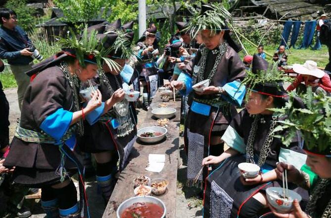 早餐后前往空申村寨依山而建,四周山巒起伏,林木蔥蔥,一條清澈的小溪從寨旁流過,民居布局合理,吊腳樓鱗次櫛比。這里最為世人矚目的是每年一度的“茅人節(jié)”。每年農(nóng)歷二月至三月,成年男女青年不論年齡大小,結(jié)婚已否,凡自己樂意都可以任意找與自己情意相投的伴侶結(jié)隊(duì)到茅人坡扎茅人、對(duì)情歌、逗趣。特別意合情投者,則相互暗示,離群另尋靜處。節(jié)日氣氛熱烈、奔放、自由、浪漫。農(nóng)歷三月三,被譽(yù)為“世界超短裙故鄉(xiāng)”的榕江縣兩汪鄉(xiāng)空申苗寨人山人海,熱鬧非凡,苗族同胞歡聚一堂,慶祝自己最古老的“情人節(jié)”——茅人節(jié)。茅人節(jié)(古老的苗族情人節(jié))苗語為“撈沙麗”,又稱作“爬茅人坡”、“插茅人”。相傳,短裙苗族古時(shí)有本寨男女不通婚的習(xí)俗,婚姻由父母包辦,姑娘都要遠(yuǎn)嫁他鄉(xiāng),許多同寨青梅竹馬的男女不得不勞燕分飛。遠(yuǎn)嫁的姑娘陽春三月均要返回娘家?guī)椭焊?。勞作之余,她們便帶著“三月粑”邀約寨里的未婚姑娘和小伙子到山上唱歌,用歌聲抒發(fā)與心上人被迫分離,遠(yuǎn)嫁他鄉(xiāng)的傷悲,并勸告未嫁的妹妹不要遠(yuǎn)嫁,向情人傾訴內(nèi)心深處的思念。唱到后來常常是淚水漣漣,泣不成聲。為了表達(dá)對(duì)家鄉(xiāng)和情人的依戀,她們用新的嫩綠枝葉和茅草扎成高低大小不等的“茅人”把,捆在杉樹桿上,然后插在最高的山頂上,一般插兩邊低排列,中間最高的象征大姐,兩邊低的為妹妹,寄予姐妹情意。我們結(jié)束游覽,返回榕江入住休息。