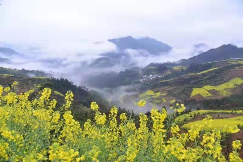 山巒、云霧、村落、梯田錯(cuò)落有致