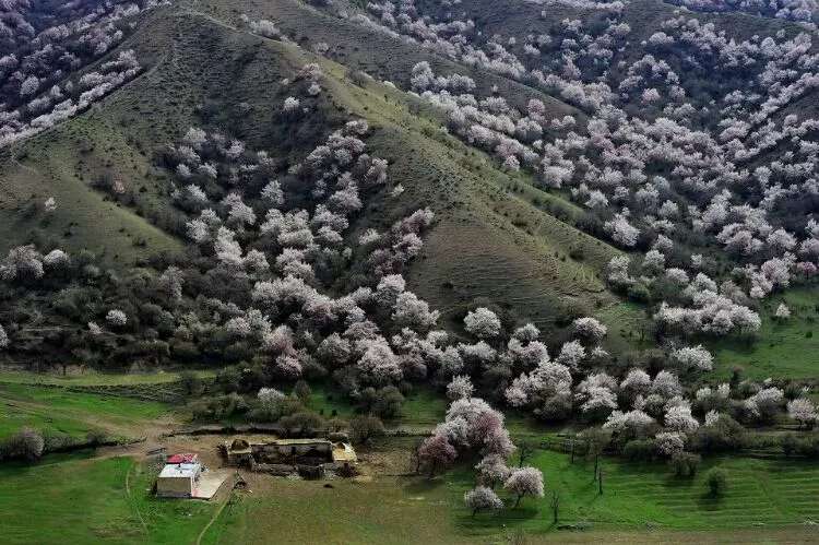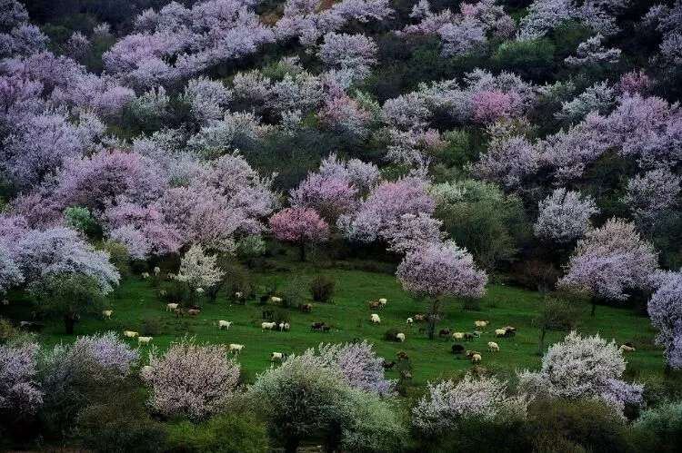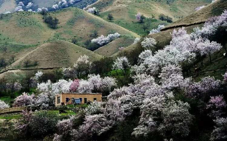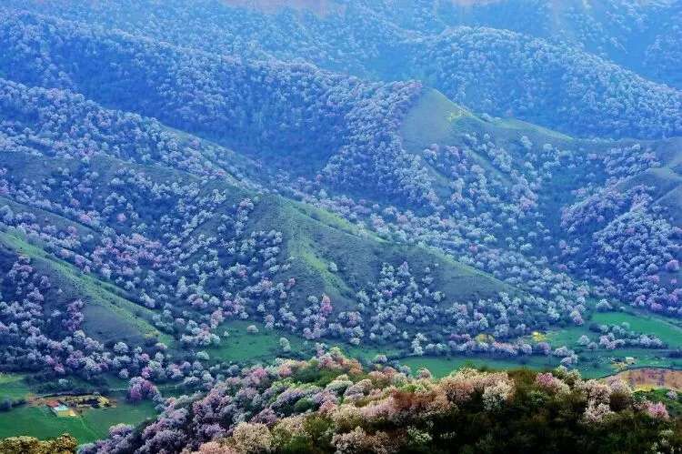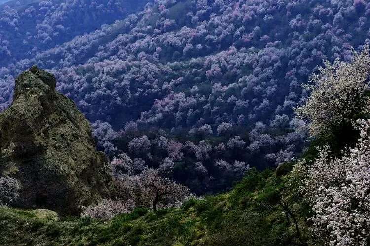 早春三月, 霍城縣大西溝福壽山景區(qū)杏花盛開,景色迷人,春花爛漫,香艷滿枝的時候,紅 蘭 粉 紫 白 各色鮮花含苞吐蕊,爭相齊放,滿山遍野,姹紫嫣紅,秋天紅葉鋪滿山腰,碩果掛滿枝頭,碧野在著名的《天山景物記》中記敘這樣的場景:“春天繁花開遍峽谷,秋天果實壓滿山腰,每當花紅果熟,正是鳥雀百獸的樂園”寫的正是大西溝。