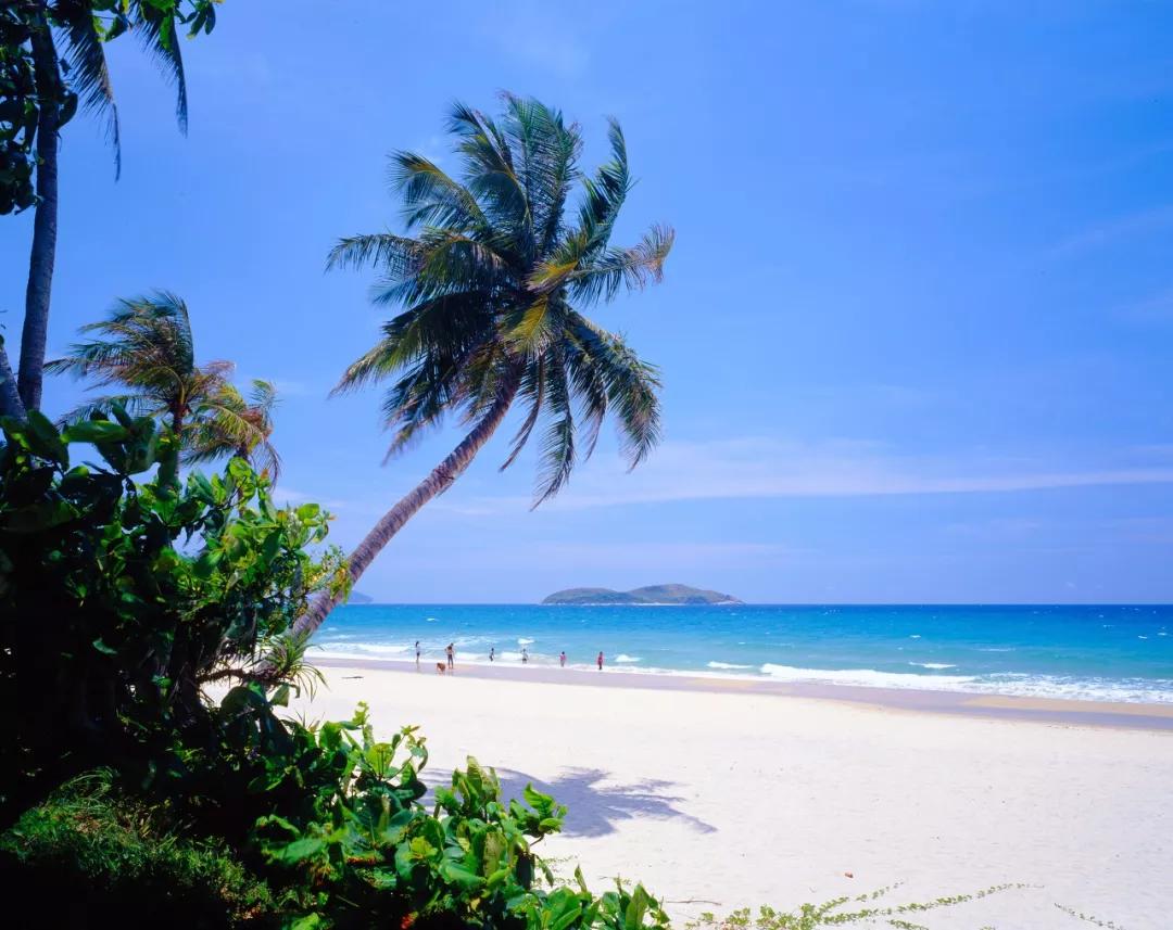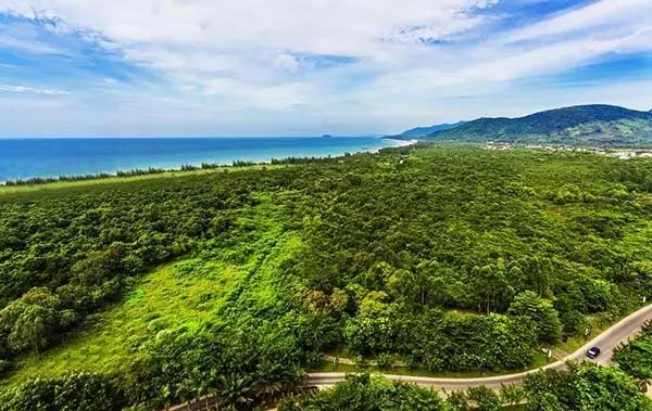灣內(nèi)植被繁茂,有大片椰林、橡膠等熱帶作物,椰樹檳榔,相映成趣。白沙碧海,藍天流云,自成畫卷,更有青梅翠帶,溪流湖泊,秀嶼奇石,細浪柔沙,美不勝收。