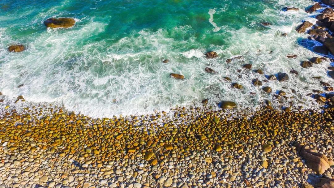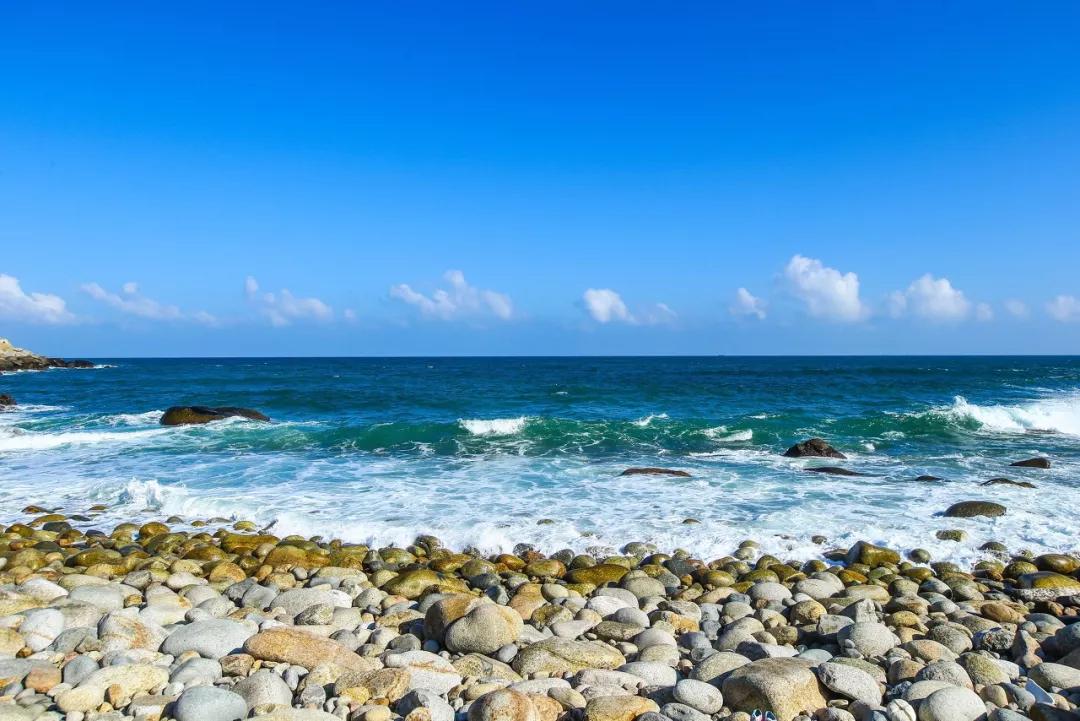 這里弓狀的數(shù)百米長的海灘上,沒有潔白的沙帶,人臨此境,首先內(nèi)陸到湛藍的海水,再是密密麻麻的卵石。