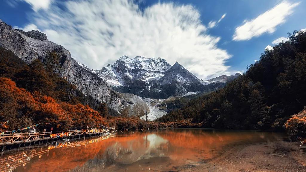乘觀光車到達(dá)龍同壩,景區(qū)以仙乃日(6032,藏語(yǔ)觀世音菩薩)、央邁勇(5958,藏語(yǔ)文殊菩薩)、夏諾多吉(5958,藏語(yǔ)金剛手菩薩)三座雪峰為核心區(qū),北南向分布,三座雪山呈品字形,三峰藏名為“念青貢嘎日松貢布”,意為“三怙主雪山”,是眾生朝圣積德之所在地,徒步抵達(dá)沖古寺(藏語(yǔ)意為填湖造寺,海拔3900米),由草地、森林、小溪和嘛呢堆組成的天然沖古草坪,使你真正感覺到大自然的雄壯、美麗、神奇和嫵媚;