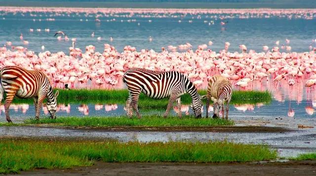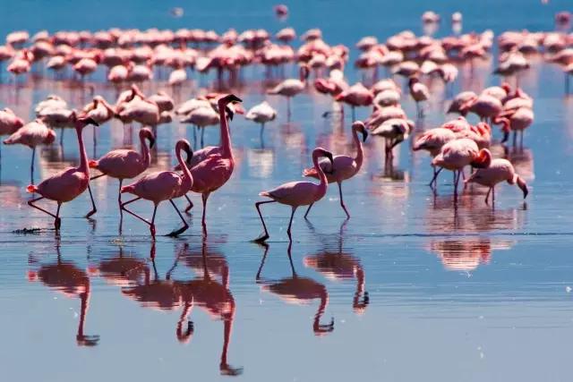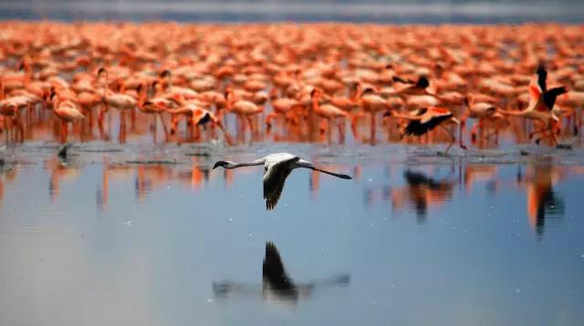 東非大裂谷猶如地球的傷痕,又好像是巨人的手筆,一連串蒸騰、冒泡的鹽堿湖沿著裂谷排開。別的生物都想遠離腐蝕性的湖水,但火烈鳥卻不怕,成千上萬只迅速將大地和湖泊染成了粉色。近距離觀察,這些粉色的家伙確實不算漂亮。不過,待到它們展開雙翅,從頭到腳都是紅與黑的變換,在青山綠水中立刻成為人們眼中的焦點。不過,近年來火烈鳥已經(jīng)從納庫魯湖搬到了博戈里亞湖,想看 “紅云”的話,記得調(diào)整好你的行程。
