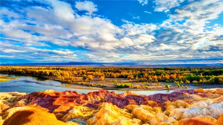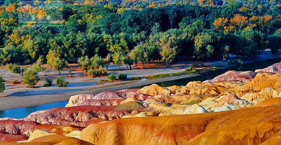 【五彩灘】(游覽時間60分鐘)五彩灘位于新疆北部,五彩灘又名五彩河岸,我國唯一的一條注入北冰洋的河流。五彩灘地貌特殊, 山勢起伏、顏色多變,其是由激猛的流河侵蝕切割以及狂風(fēng)侵蝕作用而共同形成。由于河岸巖層間抗風(fēng)化能力的強弱程度不一而形成了參差不齊的輪廓,這里的巖石顏色多變,且在陽光照射下,巖石的色彩以紅色為主,間以綠、紫、黃、白、黑及過渡色彩,色彩斑斕、嬌艷嫵媚,因此被稱作“五彩河岸”、是“新疆最美的雅丹地貌”。