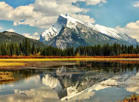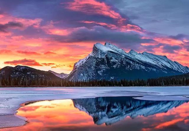 而畫(huà)面中如明鏡般純凈的美湖就是著名的朱砂湖(Vermilion Lakes)。朱砂湖距離班夫鎮(zhèn)3公里,此處是日出最漂亮的地方,也是整個(gè)落基山最富盛名的攝影地之一。