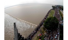 錢江潮,又稱海寧潮。以“一線橫江”被譽(yù)為“天下奇觀”。海寧觀潮之風(fēng)漢時(shí)即已蔚然,唐宋時(shí)更盛。北宋詞人潘閬所唱“長(zhǎng)憶觀潮,滿郭人爭(zhēng)江上望。來(lái)疑滄海盡成空,成面鼓聲中。弄潮兒向濤頭立,手把紅旗旗不濕。別來(lái)幾向夢(mèng)中看,夢(mèng)覺尚心寒?!北闶钱?dāng)年“弄潮”與“觀潮”的真實(shí)寫照。