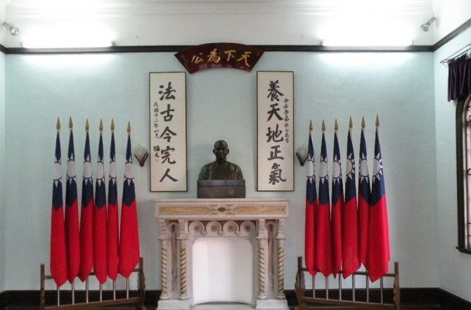 鐵門兩邊原本鑲有中國(guó)國(guó)民黨黨徽?!敢欢?bull;三事件」發(fā)生後,當(dāng)時(shí)的澳門市行政局在1967年1月2日發(fā)出公告,禁止在澳門懸掛和顯示敵對(duì)中華人民共和國(guó)的外國(guó)旗幟、徽章和標(biāo)志。次日,澳門政府派員到該館拆除鐵門,并以專門訂造的,沒(méi)有中國(guó)國(guó)民黨黨徽?qǐng)D樣的鐵門取代。不過(guò),展覽館內(nèi)孫中山先生半身像兩旁仍然可以展示中華民國(guó)國(guó)旗,成為澳門唯一一處可以公開(kāi)展示中華民國(guó)國(guó)旗的地方。