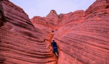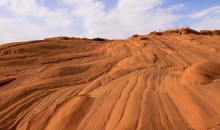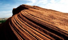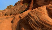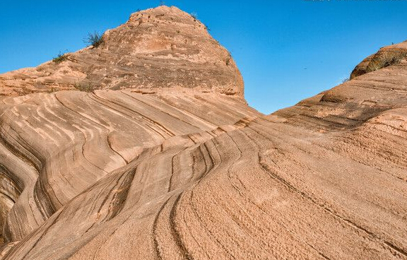波浪谷是一種紅砂巖地貌,因巖砂上的紋路像波浪而得名,巖石上纖細(xì)的紋路,揭示了沙丘沉積的運(yùn)動過程,紋路的變化反映出每一層砂巖隨著沉積礦物質(zhì)的含量不同,而產(chǎn)生的顏色深淺差異,紅色主要是由鐵和錳的氧化而產(chǎn)生,這些顏色往往在交錯處和角落里形成更加復(fù)雜與抽象的圖案。它的紋理線條比較清晰,像是一層層的波浪,也圍繞著波浪起伏的小山丘形成了不同的走向,極其具有觀賞性。