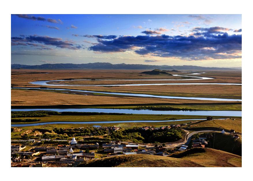 黃河第一彎地勢(shì)平坦,水流舒緩,小島、岸邊紅柳成林。索克藏寺院修筑于黃河第一彎山凹臨河處,白塔古寺,帳篷炊煙相伴黃河,更顯自然悠遠(yuǎn)博大,這里有四川省最大的草原,面積近3萬平方公里,由草甸草原和沼澤組成。,第一灣位于若爾蓋縣唐克鄉(xiāng),距縣城61公里。地處草原腹心地帶,白河于此匯入黃河,形成浩大氣勢(shì),草原地勢(shì)平坦,一望無際,人煙稀少。紅軍二萬五千里長(zhǎng)征曾多次通過這里