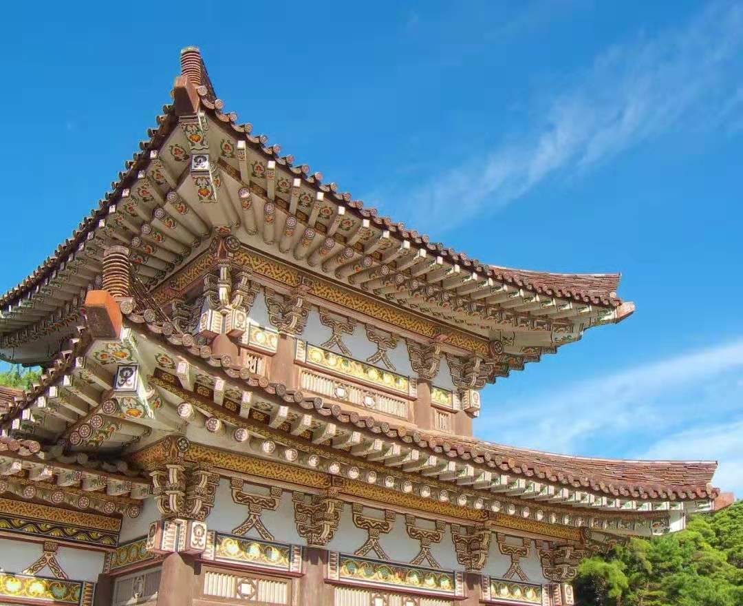 大雄殿是普賢寺最華麗最大的建筑,位于寺院正中央,建筑結構如同中國的寺廟。黑色的魚鱗瓦,朱紅色的圓木柱子,金色的門欞,大殿正門面額上的牌枋黑底金字寫著漢字“大雄殿”。