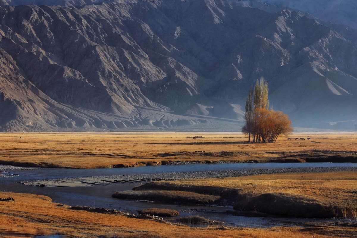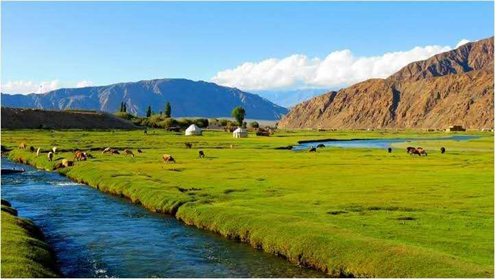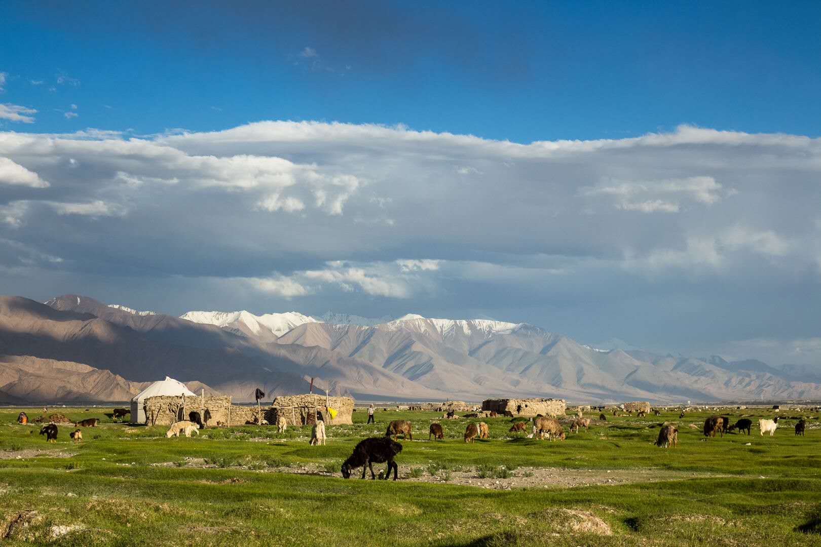 阿拉爾金草灘就在塔什庫爾干縣城邊上,在石頭城下,因那里有一個叫阿拉爾的鄉(xiāng)村,故得名阿拉爾金草灘,因有塔什庫爾干河流經此處,這里水草豐美,牛羊遍地,和遠處的雪山白云藍天交融在一起十分漂亮。我們去的時候夕陽夕照,碧綠的草灘一片金色,遠處牧人白色的氈房,羊群都沐浴在夕陽下,阿拉爾金草灘由此得名。