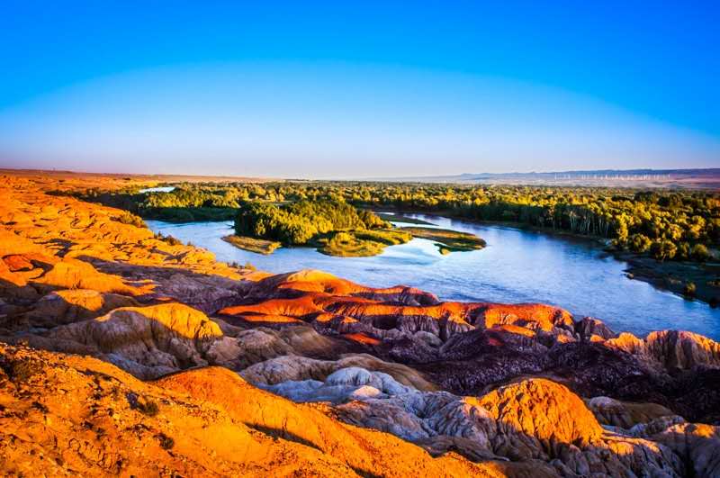 五彩灘風(fēng)景區(qū)前有大型的風(fēng)力發(fā)電網(wǎng)站。北岸山勢起伏、顏色多變,其是由激猛的流河侵蝕切割以及狂風(fēng)侵蝕作用而共同形成。由于河岸巖層間抗風(fēng)化能力的強(qiáng)弱程度不一而形成了參差不齊的輪廓,這里的巖石顏色多變,且在落日時(shí)分的陽光照射下,巖石的色彩以紅色為主,間以綠、紫、黃、白、黑及過渡色彩,色彩斑斕。每當(dāng)刮風(fēng)的時(shí)候,溝壑里、巖石下,到處都會(huì)發(fā)出長短不一、高低不同的怪叫聲。