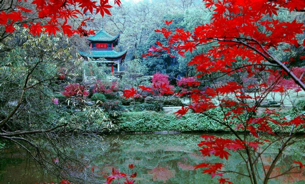 袁枚到了清風(fēng)峽,只見這里三面環(huán)山,楓葉紅的像火,中間開闊處有座亭子,石柱子,琉璃瓦,飛檐高挑。亭子的匾額上寫著“紅葉亭”三個(gè)大字,柱子上刻了一副對聯(lián):“山徑晚紅舒,五百夭桃新種得,峽云深滴翠,一雙馴鶴待籠來?!痹犊戳藢β?lián),不住點(diǎn)頭,望望匾額,好像想說什么,又沒說出口來。他離開了清風(fēng)峽,參拜了麓山寺,觀賞了白鶴泉,登上了 云麓宮,才興盡下山。