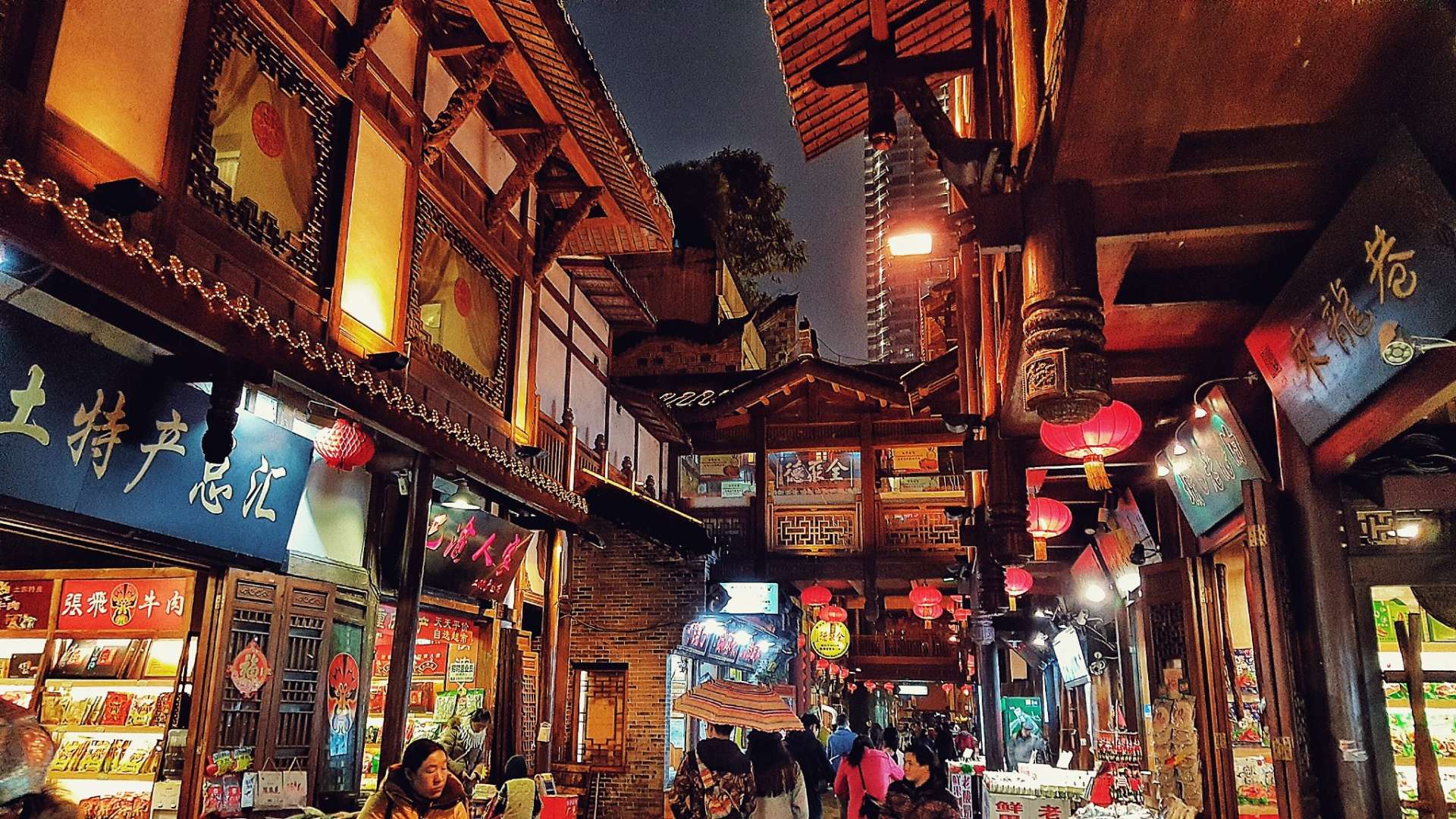 展現(xiàn)的是“另類美食城”的景色,位于第4層,集中了中外名店。臨江一面有工匠當(dāng)街打糍粑、切桃片、烤制花生糖,以及現(xiàn)場(chǎng)演繹美食特產(chǎn)制作工藝,臨崖一面有小吃店,旦旦面、豬兒粑、大湯圓、歌樂(lè)山辣子雞、黔江雞雜,老重慶毛血旺等。