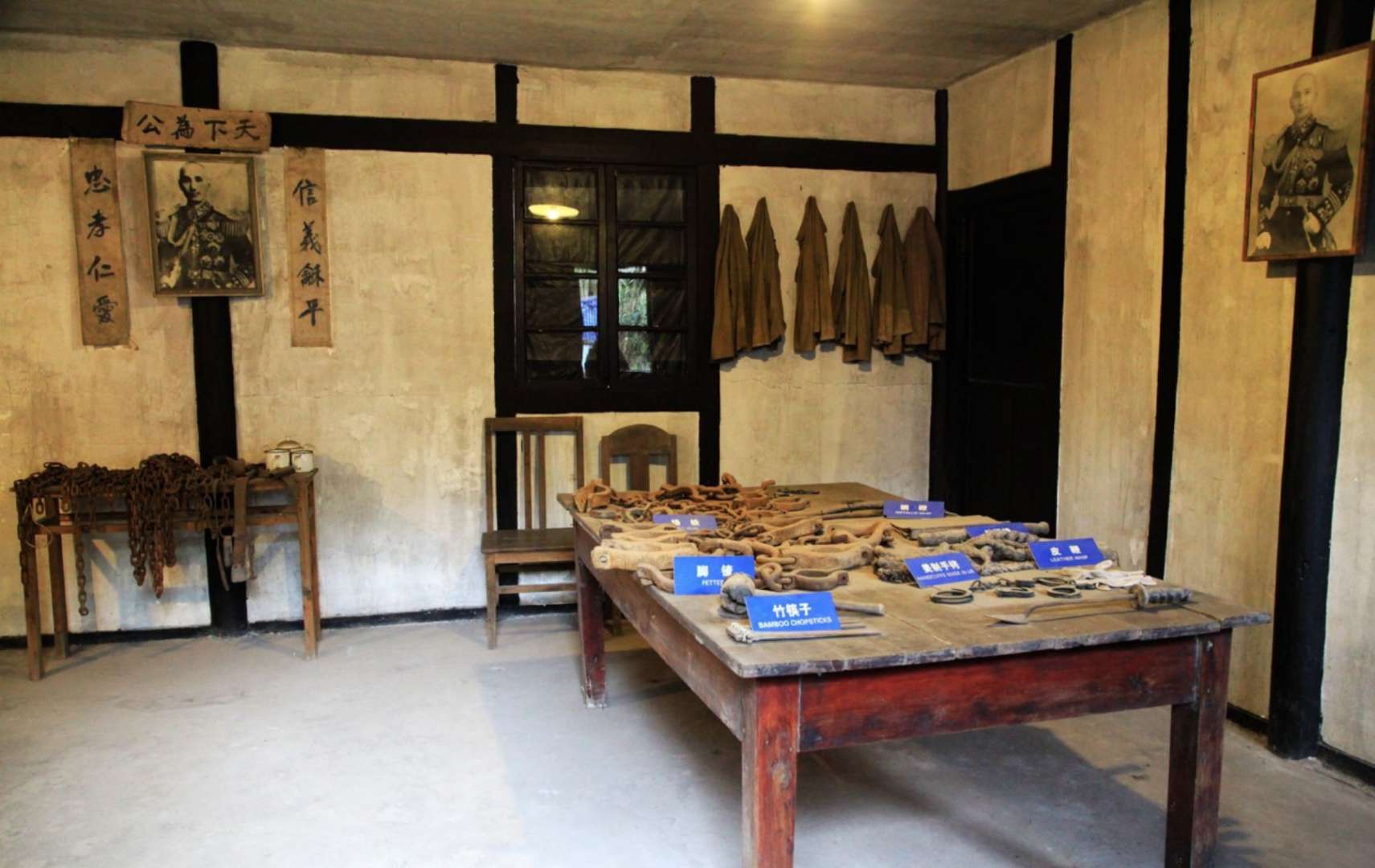 外院是辦公室、刑訊室。外院墻上寫(xiě)有“長(zhǎng)官看不到、想不到、聽(tīng)不到、做不到的,我們要替長(zhǎng)官看到、想到、聽(tīng)到、做到”等標(biāo)語(yǔ)。渣滓洞有牢房、審訊室、看守所長(zhǎng)室,還有審訊臺(tái)、鐵鎖鏈、竹簽、辣椒水、老虎凳等酷刑,“老虎凳”是一個(gè)長(zhǎng)凳子,再把手腳都捆到凳子上,給腳腕下落磚頭,落到第三層的時(shí)候腿就斷了。在白公館和渣滓洞里,有近三百英烈在這里被殺害。