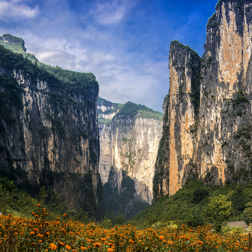 夔門兩側(cè)的高山,南名“白鹽山”,北曰“赤甲山”,拔地而起,高聳入云;近江兩岸則壁立如削,恰似天造地設(shè)的大門。這里的河寬只有百余米。“眾水會(huì)涪萬,瞿塘爭(zhēng)一門”。杜甫用一“爭(zhēng)”字,活畫出夔門的赫赫水勢(shì)。乘船入夔門,高約千米的赤甲、白鹽兩山對(duì)峙,滾滾激流、滔滔浪花就從這門中爭(zhēng)喧著擠擁進(jìn)去。正因其水大河窄,故汛期水位,一日之間,可陡漲一、二十米,年水位的變幅,甚至可相差五十多米。白鹽山系因粘附在巖石上的含鈣質(zhì)的水溶液色似白鹽而得名;赤甲山因含有氧化鐵的水溶液粘附在風(fēng)化的巖層表面,此山土石呈紅色,如人袒背,故名赤甲山。這兩座山都是石灰?guī)r,長(zhǎng)期的風(fēng)剝雨蝕,使兩岸巖壁,好似刀削斧砍一般,形成十分奇麗的自然景觀。版權(quán)所有山東聊城聊之旅國(guó)際旅行社有限公司,轉(zhuǎn)載必究!凡緩坡沖坪處,因有植被而呈蒼青色。面江迎風(fēng)之絕壁陡巖,雖然寸草難生,而各現(xiàn)異彩,有白色、赤色、黃色、褐色等。這些色調(diào)和晨曦、晚霞、明月交相輝映,形成了“赤甲晴暉”、“白鹽曙色”和“夔門秋月”等勝景。