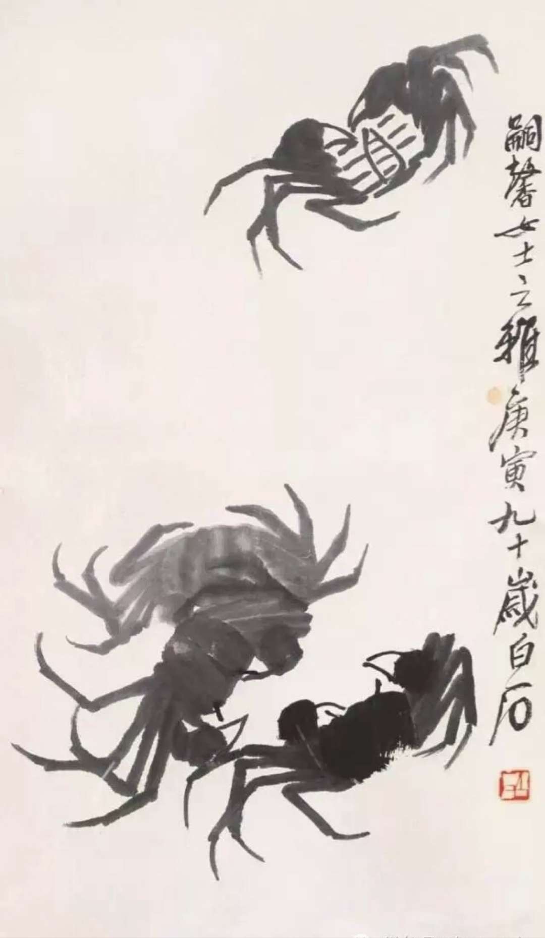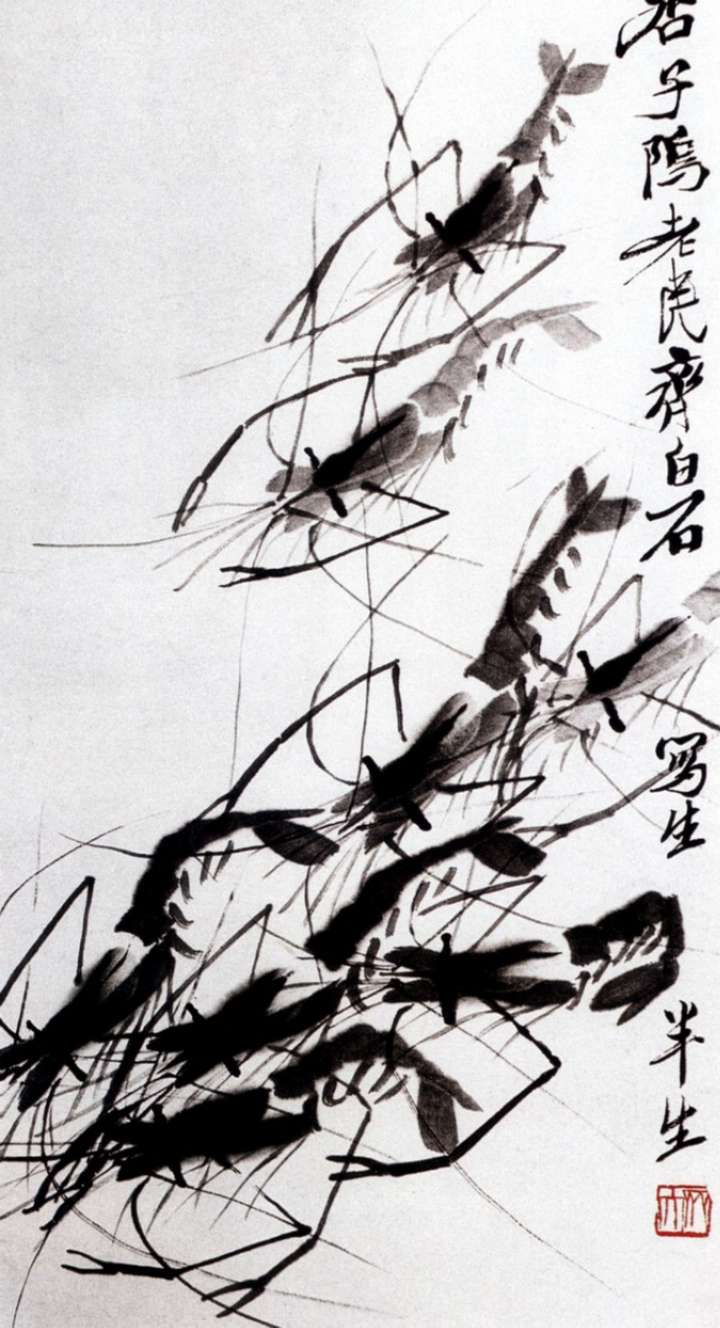 齊白石擅作花鳥蟲魚。畫的蝦更是出神入化,濕漉漉的,宛在水中,靈動(dòng)活潑,神韻充盈。為了畫得逼真,他在一只大海碗里,養(yǎng)了幾只活蝦,放在案頭。作畫之前,先盯上半天,仔細(xì)觀察它們的體態(tài)、顏色、爭斗時(shí)的姿態(tài)。然后,研磨鋪紙,作起畫來,不僅把蝦的身體結(jié)構(gòu)表現(xiàn)得細(xì)致入微,而且把蝦身體的彈性都表現(xiàn)得充滿力量,其長螯的勁力和觸須的柔順處理得相映生輝。蝦眼和蝦腦上的重筆,干濕用得更是恰到好處,令人叫絕。