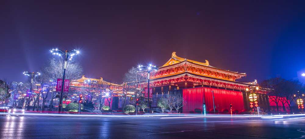 廣場(chǎng)上8根朱紅LED蟠龍柱高20米,柱頭直徑8.9米,柱身直徑2米,東西兩側(cè)各有四柱,取意為四方、四極、四周、四海,與八數(shù)相合,意為四面八方、四通八達(dá),完美地詮釋了大唐不夜城的建筑美學(xué),使得開(kāi)元廣場(chǎng)成為了一個(gè)露天宮殿,每位置身其中的游客仿佛回到鼎盛王朝。當(dāng)LED燈柱在古城夜色中點(diǎn)亮,不夜城更加煥發(fā)出“不夜”之魅。