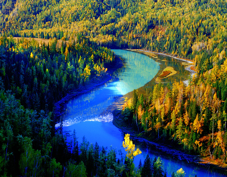 深秋時節(jié)是月亮灣色彩最豐富景色最迷人的時候。山頂?shù)难┖涂~緲的霧是白色,山腰的西伯利亞落葉松和白樺樹的葉是金黃色,間雜其中的冷杉和云杉翠綠色,河水是翡翠色,九月底的月亮灣還有楓樹的紅葉映襯,簡直就是上帝的調(diào)色板。