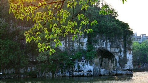 象鼻山,簡稱“象山”,位于漓江與桃花江(舊稱陽江)匯流處,因其山形酷似一只站在漓江邊伸長鼻子飽飲江水的大象而得名。象鼻山因在漓江之濱,原名“漓山”。唐會昌年間(841—846年),唐代詩人、桂管觀察使元晦以“漓山”之名與陜西臨潼的“驪山”音同,為避其誤會,又取風(fēng)景宜人之意,更名“宜山”。后又將“宜山”寫作“儀山”,因古文“宜”與“儀”通,音也一樣。唐代莫休符在《桂林風(fēng)土記》中說,漓山“一名沉水山,以其在水中,遂名之?!背了街跉v史上文人士大夫之中很少見,估計(jì)是民間的俗稱。明朝孔鏞也曾在廣東、山西、貴州等地任職。他有一首著名的《象鼻山》詩,對象鼻山作了生動的描繪: