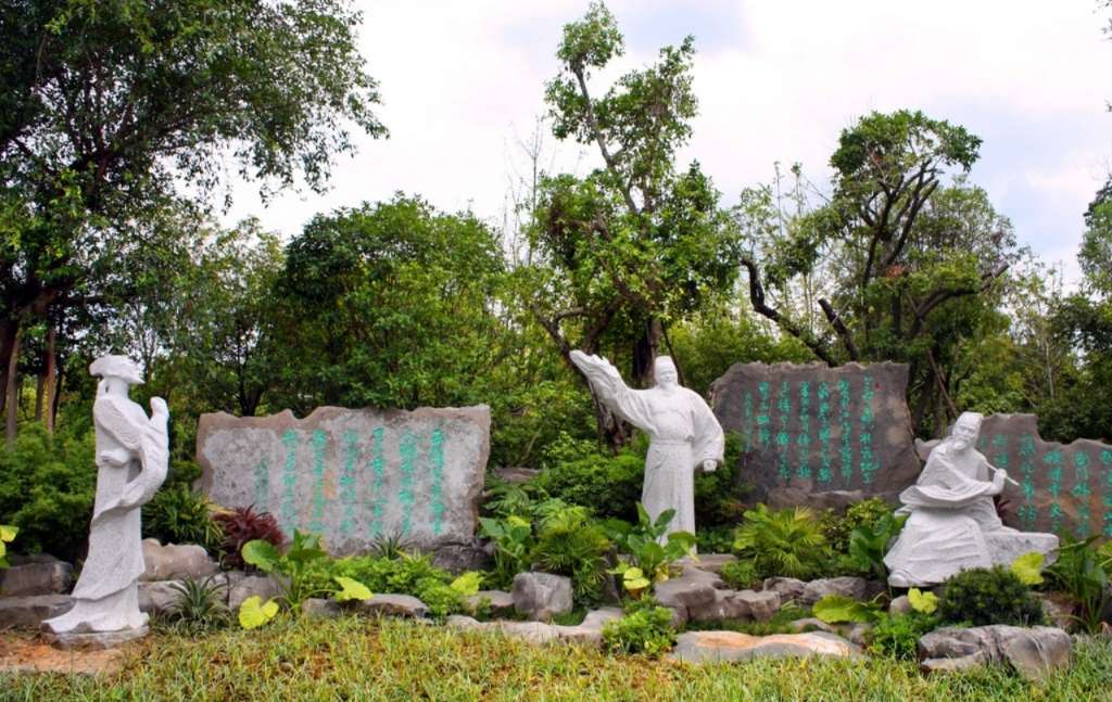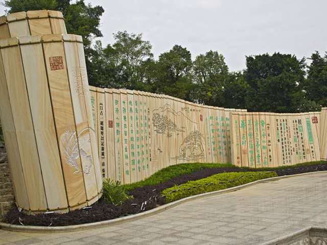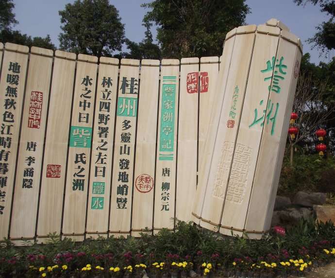 碑亭流芳是由一座仿古風(fēng)格的亭子流芳亭和柳宗元石塑組成,為了紀(jì)念訾洲最早的開發(fā)者的裴行立和讓訾洲揚(yáng)名的柳宗元而建。柳宗元石塑將人物和碑刻融合一體,這組雕刻長8米、高2.5到3米、厚80厘米,全部由花崗巖雕刻而成,總重量達(dá)45噸。石塑分為正反兩面,背面雕刻著兩首詩,均為柳宗元所作。