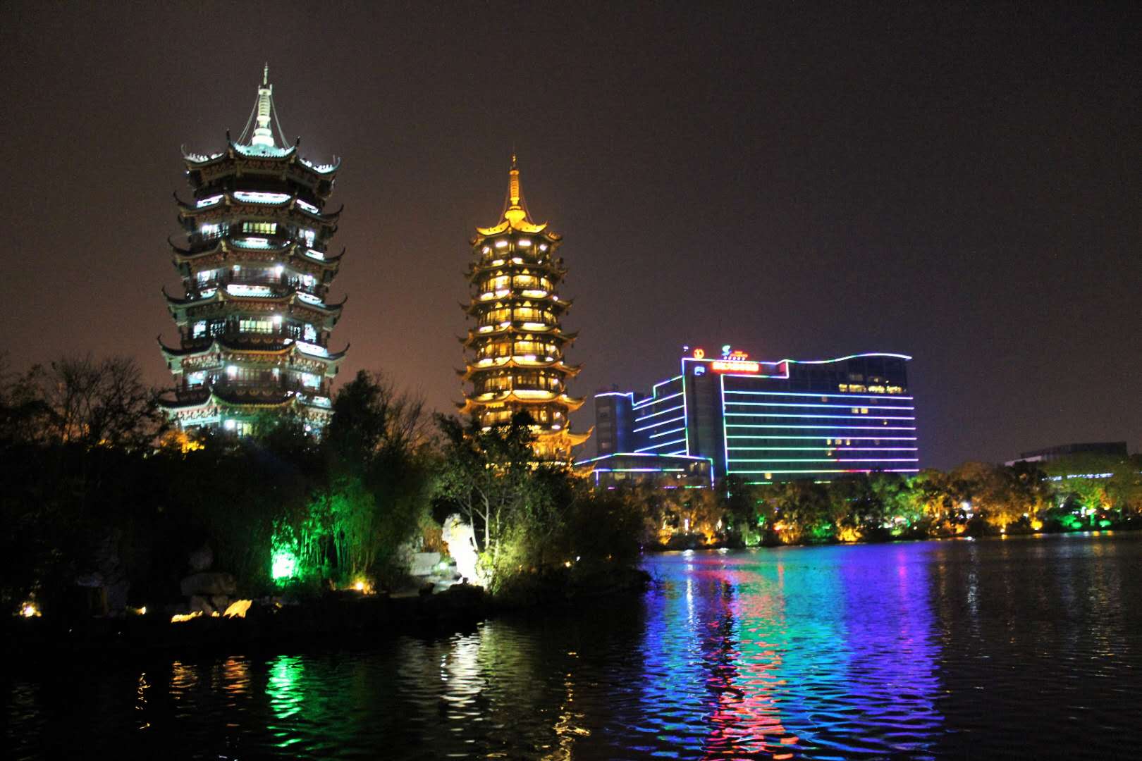 日月雙塔坐落在杉湖中,日塔為銅塔,位于湖中心,高41米,共9層,月塔為琉璃塔,高35米,共7層。兩塔之間以18米長的水下水族館相連。版權(quán)所有山東聊城聊之旅國際旅行社有限公司,轉(zhuǎn)載必究!銅塔所有構(gòu)件如塔什、瓦面、翹角、門拱、雀替、門窗、柱梁、天面、地面等均由鋼材鑄鍛而成,并以精美的銅壁畫裝飾,整座銅塔涵蓋了三項(xiàng)世界之最--世界上最高的銅塔,世界上最高的銅質(zhì)建筑物,世界上最高的水中塔。日月雙塔是桂林兩江四湖夜景重要的景色之一。