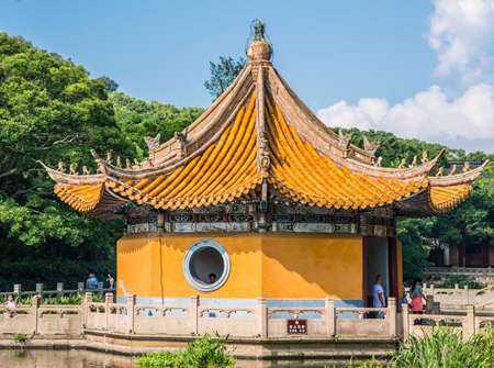 蓮花池三面環(huán)山,四周古樟參天,每年六月蓮花盛開,池中樹影、亭影、橋影倒映,構(gòu)成一幅美妙的圖畫。夏夜入靜,荷香沁人,池中銀花伴月影,形成普陀山十景之一——“蓮池夜月”,令人流連忘返。普濟(jì)寺占地37019平方米,共有10殿、12樓、7堂、7軒,計23l間,建筑面積11400平方米。全寺有六進(jìn)殿堂,自南向北貫串在一條中軸線上。山門。面寬五間,重檐歇山,正山門平時關(guān)閉,僧人游客均從東山門出入。僧人圓寂后由西山門出寺。
