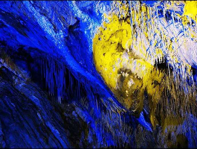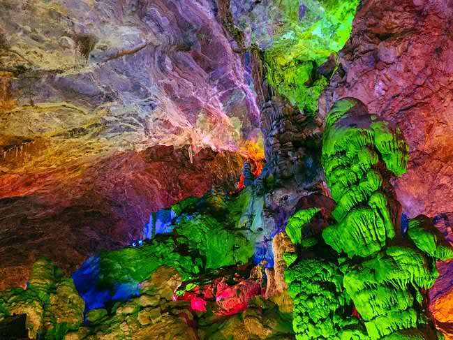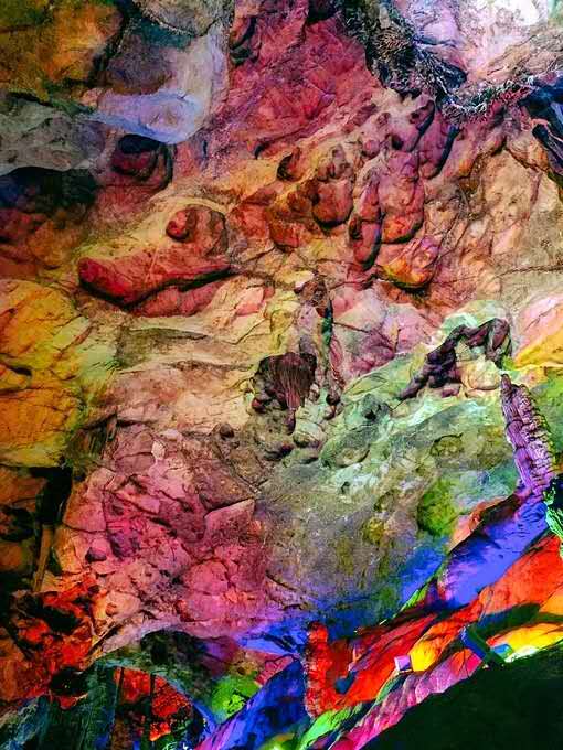 通過一道光潔的,地面上像砌滿了云片似的走廊后,(即為“臥龍壩”)就來到了第二景區(qū)——龍宮。壩上有二龍蟠伏,鱗甲浮動,閃閃發(fā)光,仿佛觸之即飛。過“溜馬槽”則為“黃龍灘”,中有仙人“煉丹井”,深不可測。設(shè)有“仙人床”,床頭有“仙人枕”,壁上有“仙人燈”,床下有“仙人履”。內(nèi)壁角有一小洞,高闊不足1米,深約1.7米,游人爬行而過,是全洞最狹窄的地方,因涼風(fēng)習(xí)習(xí),故稱“風(fēng)洞”。