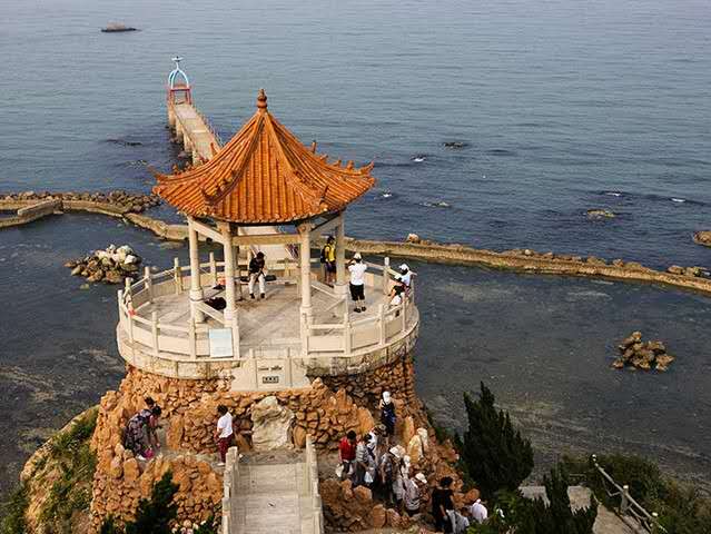 渤海雄渾之日落,南瞻“八仙相聚”的蓬萊閣,北眺遼東半島的老鐵山。仙境源東部開(kāi)口處臨海而立,頓感開(kāi)闊,該村人在此建一亭閣,高大約16米,順懸崖勢(shì)造陡峭臺(tái)階,左拐延伸出了一架棧橋,棧橋周圍劃出幾處釣魚(yú)臺(tái)與海上游樂(lè)場(chǎng);右拐直達(dá)至海灘,四周懸崖峭壁圍成一處半圓灣,實(shí)屬一靜謐之所,灘上卵石約 3 米厚,光潔與柔潤(rùn)。身臨仙境源、心情舒暢、飄然欲仙!