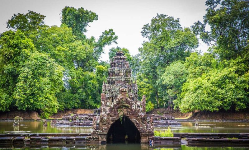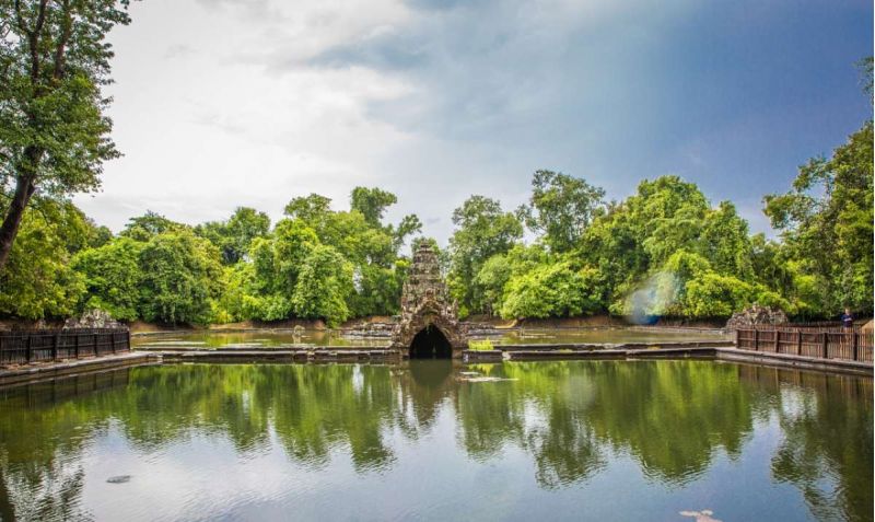 涅盤宮建于12世紀(jì),是佛教廟宇,大水池中央有個(gè)小島,島上只有一座仿造「須彌山」而建造的石塔小寺廟,石塔上雕刻兩只纏繞的巨蛇王(Naga),小島東側(cè)還有一座白馬雕像,而Neak Pean的意思是「纏繞的巨蛇」,就是取自島上的巨蛇王像而得名。