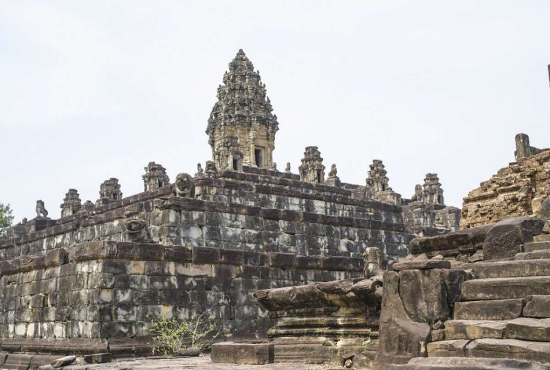 五層階層式建筑的巴孔寺(Bakong),是當時這個城市(Hariharalaya)的中心。這是一座王國廟,屬神殿山的建筑,象征了眾神所住的須彌山 (Mount Meru),將王權和神權結合在一起。這里的規(guī)劃表現(xiàn)著印度神話:眾神居住的須彌山是宇宙中心,圍墻的四周則有海洋 (護城河) 的圍繞。