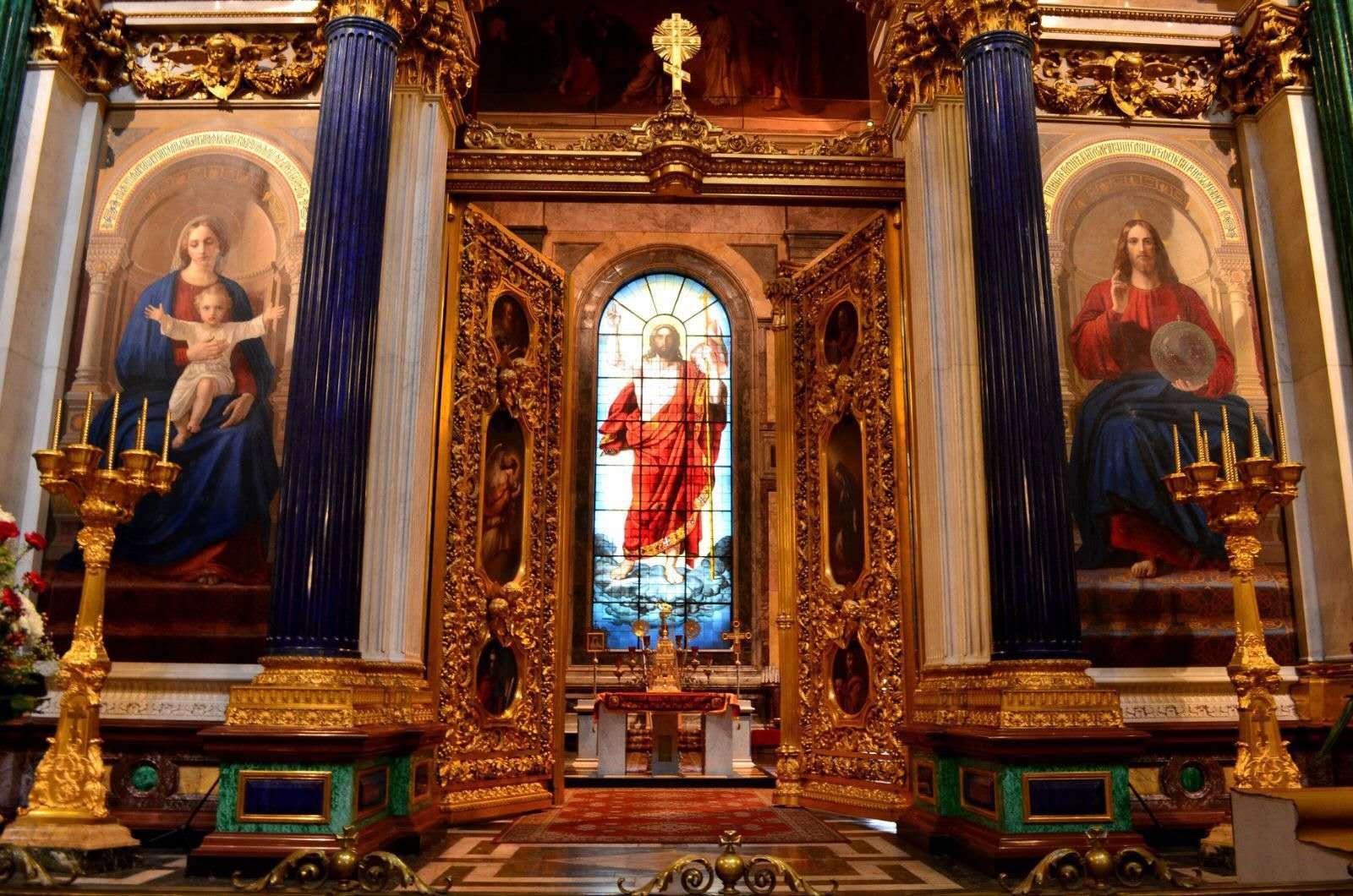 教堂內(nèi)部使用有色大理石、孔雀石、青金石等進(jìn)行裝飾。使用鑲嵌畫手法繪成的圣像中,大部分都是珍品,在中央圓頂下的卡爾·布留洛夫的作品《玉座上的圣母瑪利亞》是最值得一觀的,而裝飾教堂的300多幅浮雕和雕像個個精致無比。