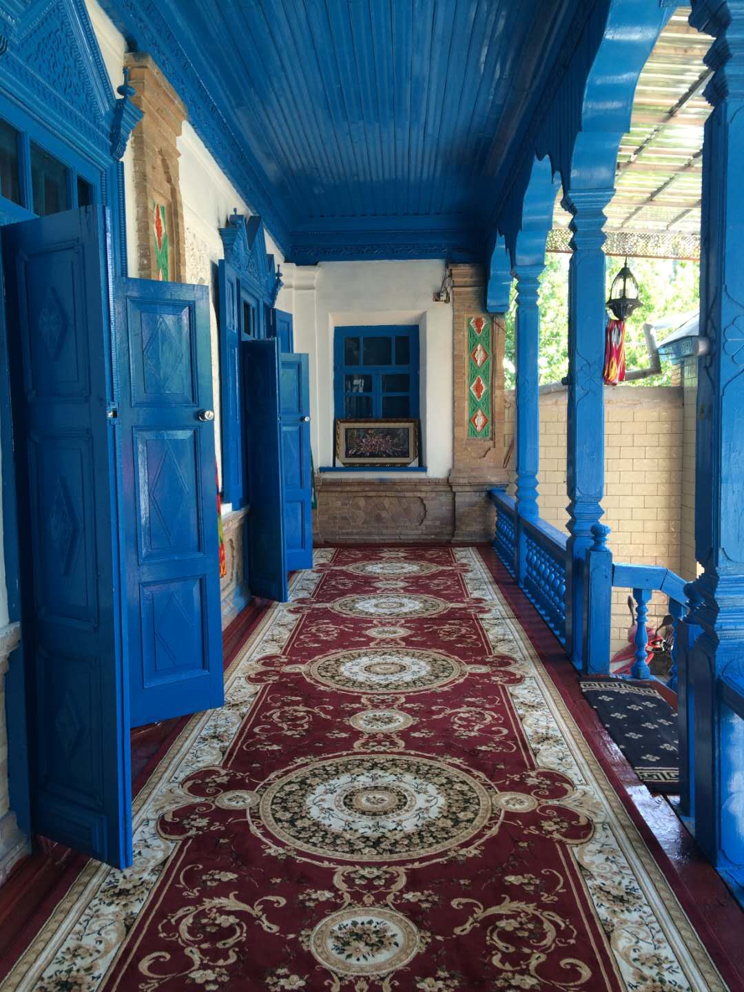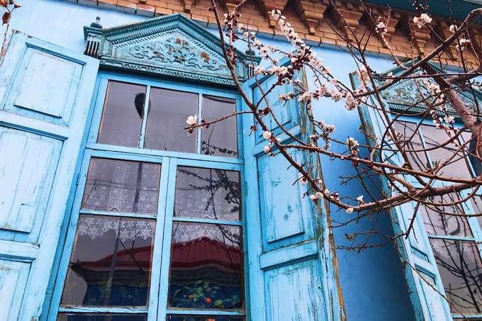 這里的民居與環(huán)境始終保持著較為完整的傳統(tǒng)風(fēng)貌與格局,頗具中西亞特色及“塔蘭奇”傳統(tǒng)文化風(fēng)格??澠涞姆课萁ㄖλ{色的使用頻率非常高,或者在外墻,或者在屋頂,更多時候是在門板和窗欞,藍色大都是主色調(diào),整個建筑顯得精致而純凈。