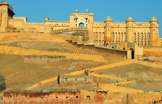 坐落在齋普爾的琥珀山山坡上的一座土黃色城堡,含比較濃厚的伊斯蘭教建筑風(fēng)格,歷史上印度曾長(zhǎng)期定都于此,古堡依山傍河而建,由眾多獨(dú)立宮殿組成,其中有著名的Sheesh Mahal(鏡宮)和Jaigarh(杰加爾堡)。