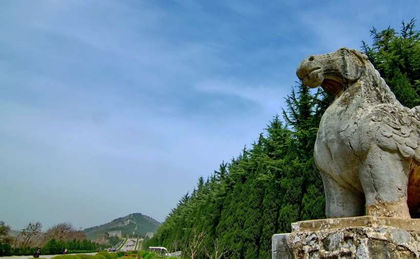 從梁山南二峰的天然雙闕起,往北依次對稱排列。端立首位的是1對高達8米有余的八棱柱石華表,這是帝王陵墓的標(biāo)志,其造型昭示著生命長存的理念和古代先民對人類生殖行為的崇拜。接著是一對昂首挺胸、渾圓壯觀的石刻翼馬,馬身兩翼雕以卷云紋,似有騰飛之勢。翼馬之北是1對優(yōu)美的高浮雕鴕鳥,是唐王朝同西域人民文化交流與友好往來的象征。緊接鴕鳥的是5對配有馭手的石仗馬和10對高4米左右的石翁仲(或稱直閣將軍)。