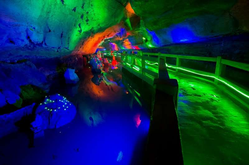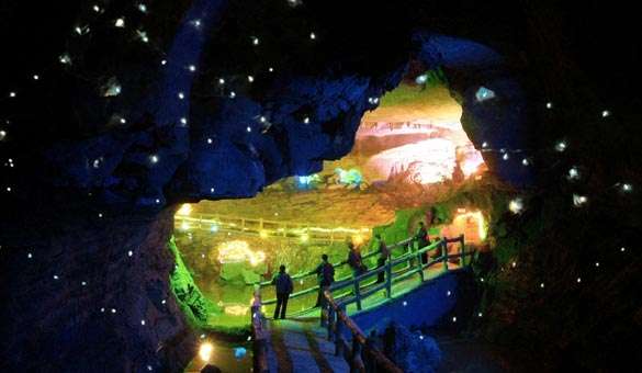 螢火蟲水洞形成于約0.65億年至2.3億年前,全長1200米,是“國家地質(zhì)公園”、國家“AAAA級旅游區(qū)”。洞內(nèi)有湖光山色、星際夢幻、黑洞探秘、幽谷星河、穿越時空等5個景段60余個景點。
