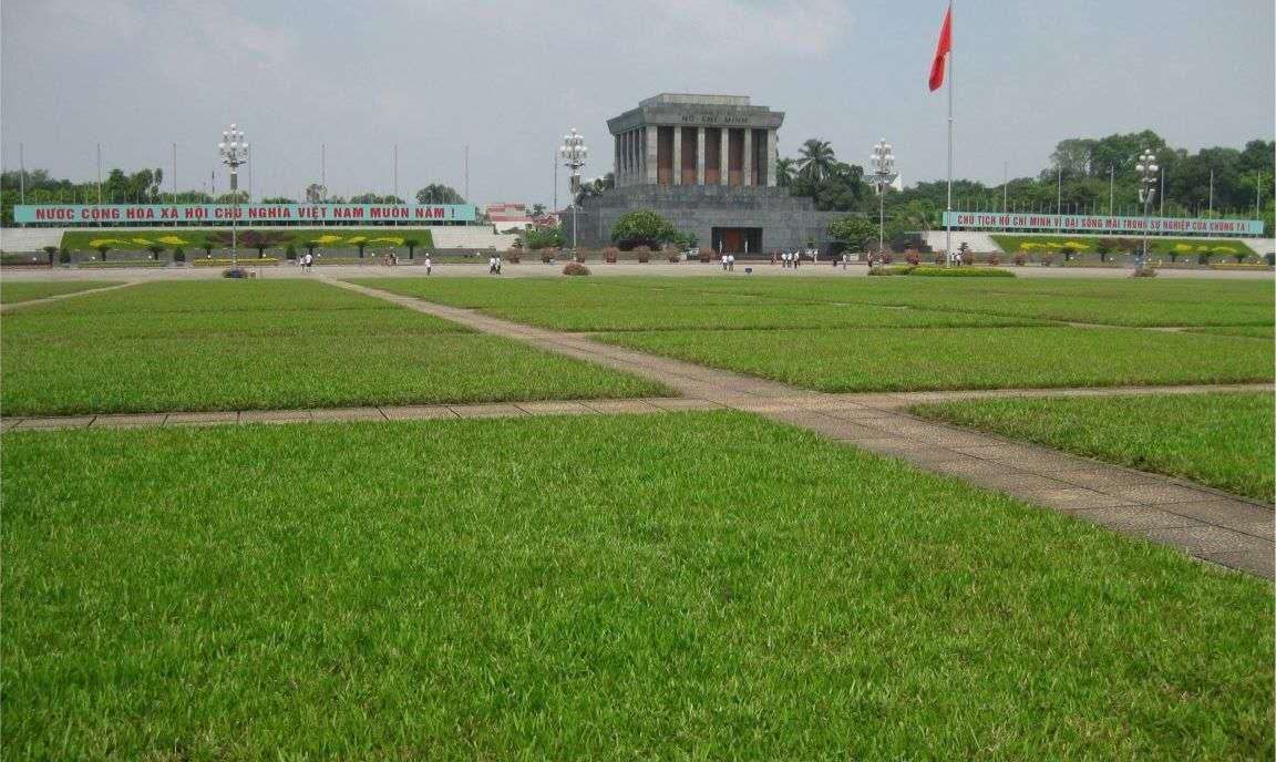 廣場(chǎng)西側(cè)為胡志明主席陵,東靠巴亭會(huì)堂,四周綠樹縈繞,建筑圍拱如壁。