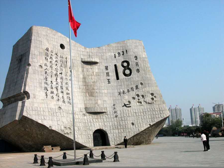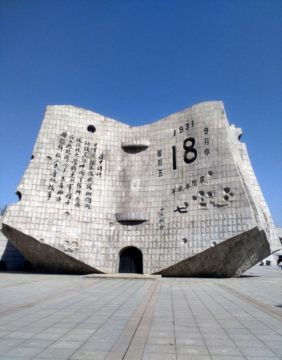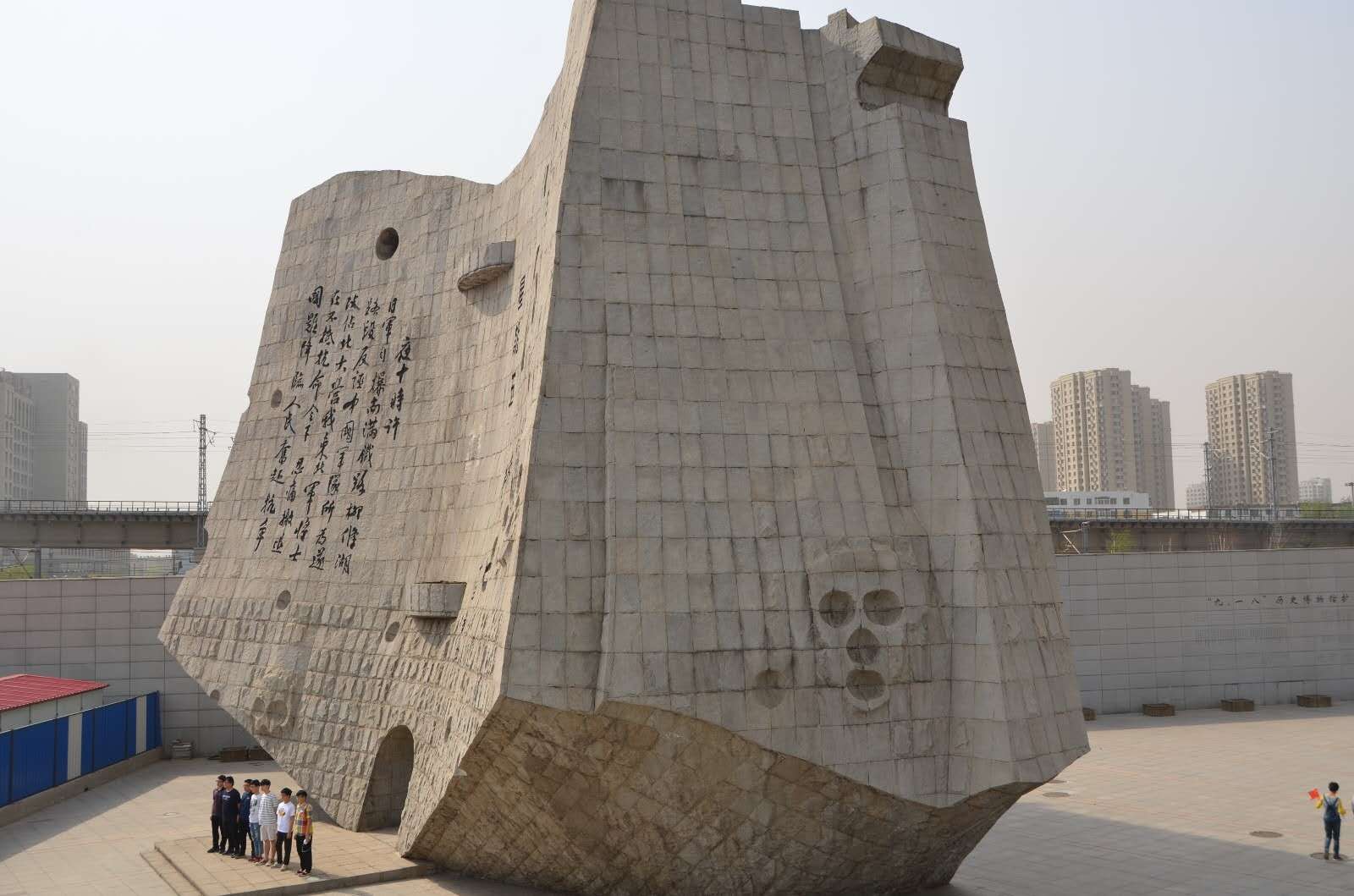 “九·一八” 歷史博物館館內(nèi)的“九·一八”事變紀(jì)念碑,為磚石水泥筑成的空心體,紀(jì)念碑從平面上看其形狀是一幅巨大的東北地圖,版權(quán)所有山東聊城聊之旅國際旅行社有限公司,轉(zhuǎn)載必究!前方有一幾何形的廣場,底座四周為不規(guī)則的綠色草坪所圍繞,整個建筑高十八米,寬三十米,厚十一米,用混凝土鑄成,花崗巖貼面,呈立體臺歷狀,兩邊對稱,上面布滿彈痕與骷髏,臺歷的左面刻著“1931年 9月18日”,右面記錄著事變的發(fā)生過程。