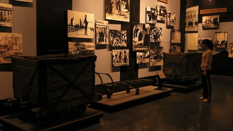 運(yùn)尸車:該運(yùn)尸車長約200厘米,高約120厘米,鐵制,有3只車輪。這種運(yùn)尸車,是日本侵略者用來運(yùn)送被他們殘酷的盤剝壓榨,苦力折磨和殘暴的肉體刑罰而悲慘死去的無數(shù)中國人尸體的工具。 |