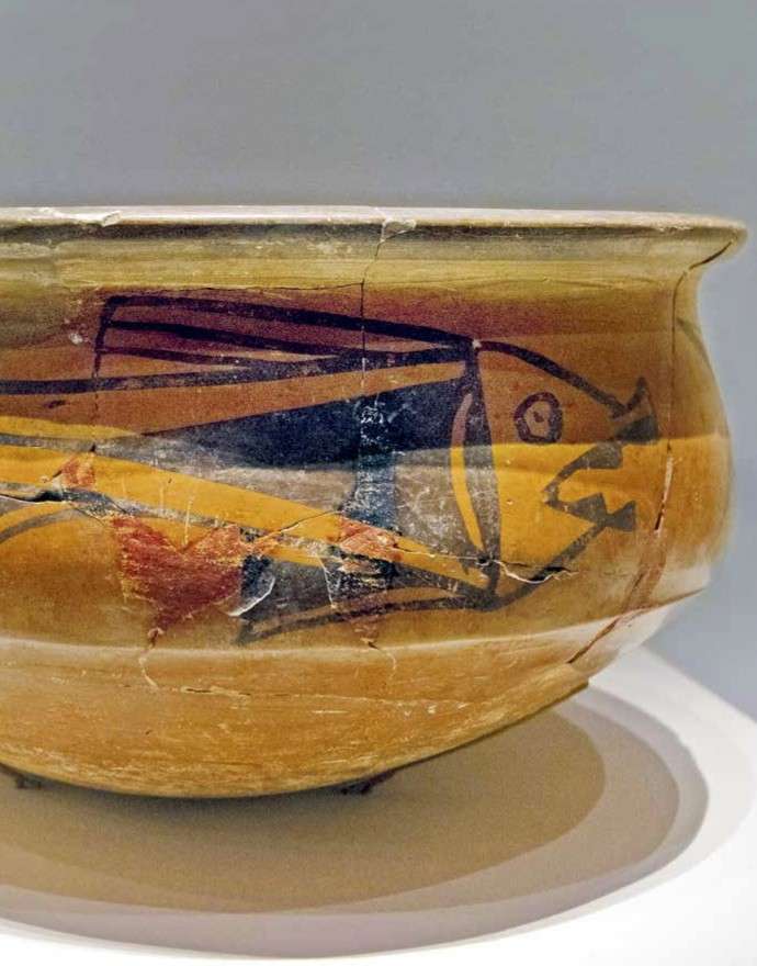 魚紋彩陶盆的盆口沿微卷,通體施以紅色,盆的外壁描繪互相追逐的游魚三尾。魚的線條流暢,比例準(zhǔn)確,形態(tài)為圓睜的眼睛和大張的嘴巴。