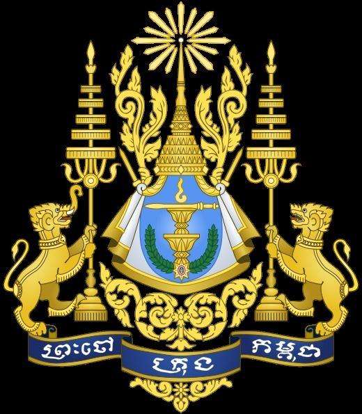 柬埔寨國徽的圖案是黃色的吳哥窟,上方有一個八角風(fēng)車。以王劍為中心線兩邊對稱的圖案。菱形圖案中的王劍由托盤托舉,意為王權(quán)至高無上;兩側(cè)為由獅子守護(hù)著五層華蓋,五在柬埔寨風(fēng)俗里象征完美、吉祥;兩邊的棕櫚樹葉象征勝利。底部的飾帶上寫著“柬埔寨王國之國王”。整個圖案象征柬埔寨王國在國王的領(lǐng)導(dǎo)下,是一個統(tǒng)一、完整、團(tuán)結(jié)、幸福的國家。