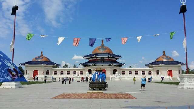 可在市區(qū)乘坐1路, 在市醫(yī)院站下車,步行至成吉思汗廣場。
