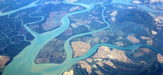 苗旺以南48公里的娘交附近,伊洛瓦底江開始分流,散作傘形分成多條支流流入安達(dá)曼海,形成河道交織如網(wǎng)的著名伊洛瓦底江三角洲。三角洲,西從勃生河口東至仰光河口,寬約242公里,南北長約90公里,面積3萬多平方公里。三角洲地區(qū)除一些高地外,概為現(xiàn)代沖積平原。地勢低下平坦,一般與海潮線相等,部分則在海潮線之下。由于每年有約3億噸的泥沙傾瀉海內(nèi),所以三角洲向外伸延的速度是驚人的,據(jù)測量,平均每年向海洋擴(kuò)展66米左右。
