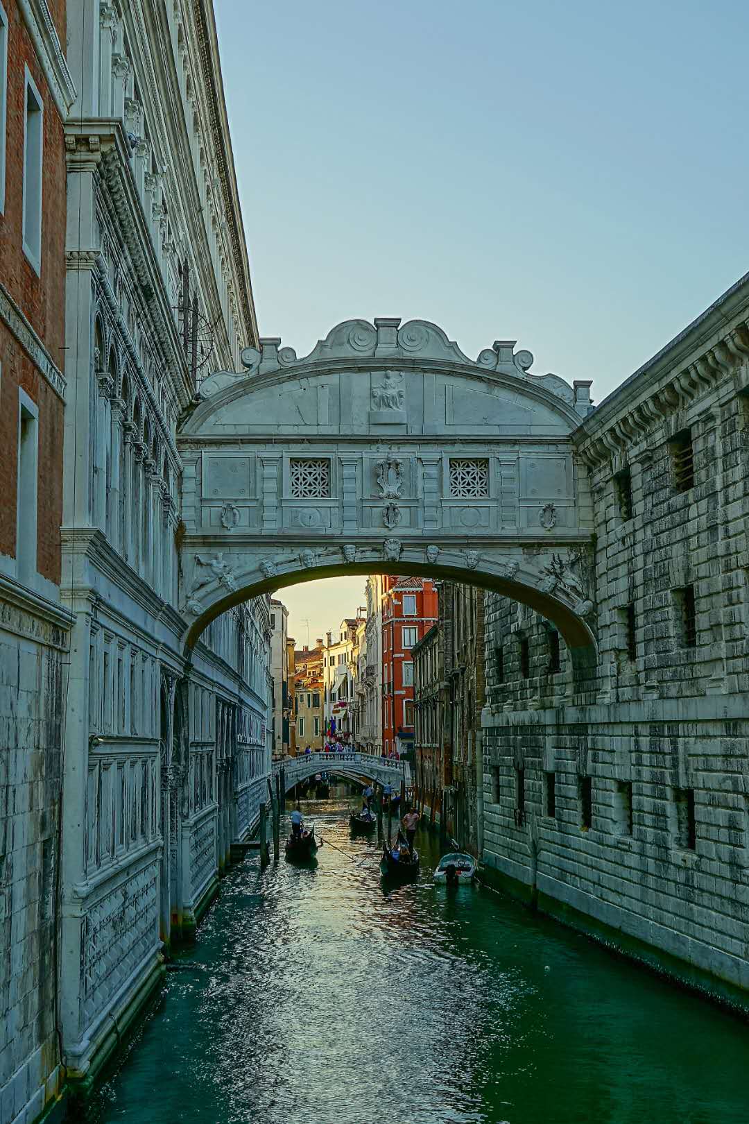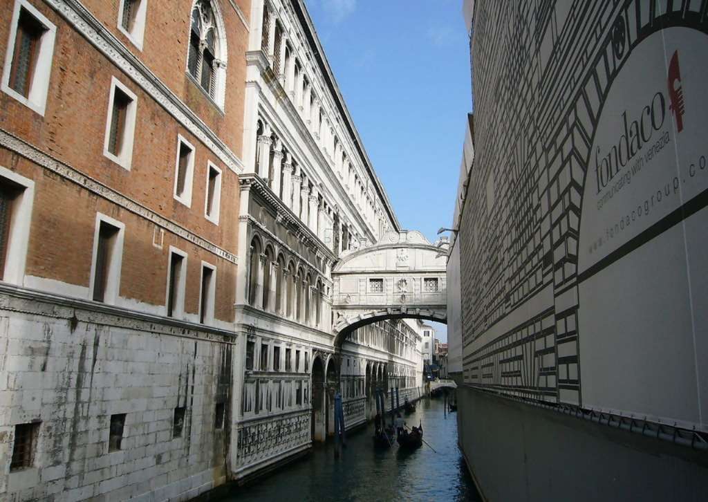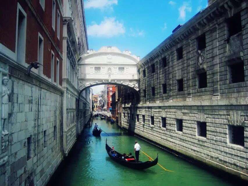 據(jù)說到威尼斯的人,一定要坐威尼斯小艇;坐威尼斯小艇的情侶,一定要經(jīng)過“嘆息橋”,且在橋下?lián)砦恰!皣@息橋”不像威尼斯的幾百座橋,供行人穿越。它是座橋,也橫過水面,但高高懸在兩棟樓宇之間。一邊是總督府。白色的大理石上刻著圖案、托著拱形的花窗,據(jù)說在十四世紀(jì)的共和國時(shí)代,里面可以同時(shí)容納一千六百位王孫貴胄。